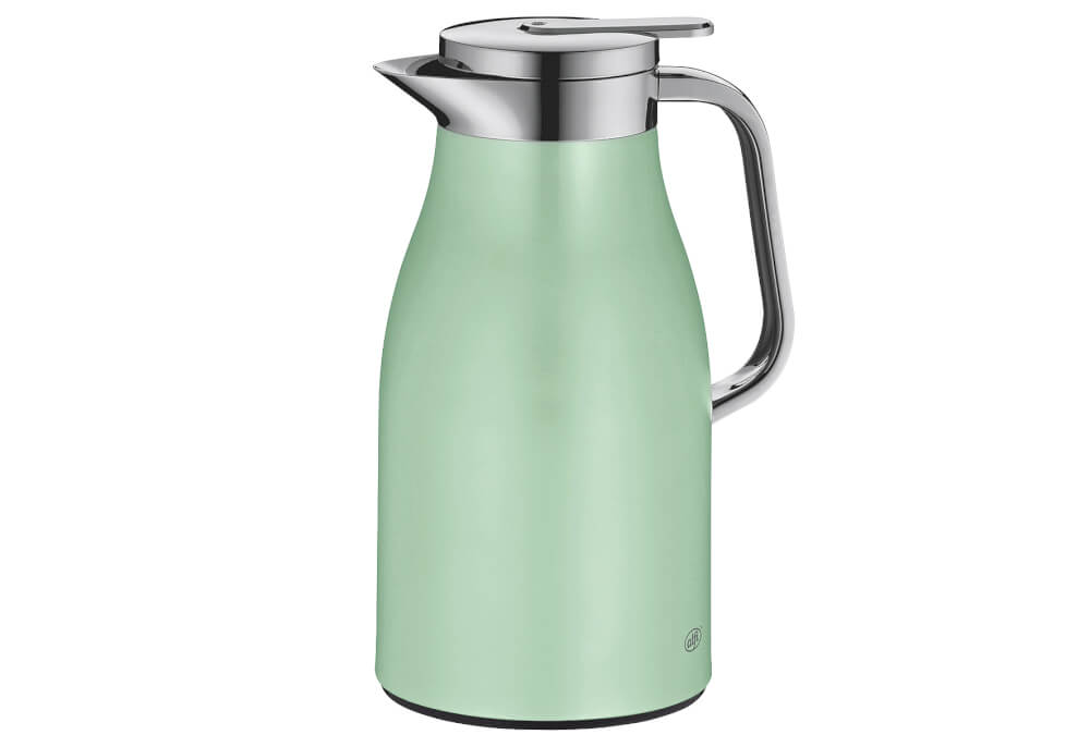 Isolierkanne "Skyline" _ AromaSafe® für perfekten Geschmack; beste Isolierleistung hält 12 h heiß und 24 h kalt; isoliert mit hygienischem Hartglaseinsatz; komfortables Ausgießen mit einer Hand; ergonomischer Griff für einfache Anwendung; hochwertiger und robuster Edelstahl; langlebig, recylingfähig für nachhaltige Freude; formschönes Design von PEARL CREATIVE DESIGN. Maße: Ø 14,7 cm, 1 l, H 26,5 cm. Farbe: pastel mint mat.