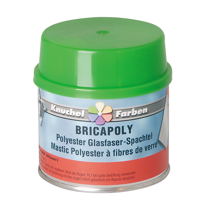 Äusserst haftfeste und schnell härtende 2-Komponenten Faser-Spachtelmasse bestehend aus einem Gemisch von hochwertigen und elastischen Polyesterharzen und Glasfasern. Eignet sich für zur Verstärkung angerosteter Bleche und Profile sowie zur Überbrückung von Löchern und Rissen auf Stahl, verzinntem Karosserieblech sowie glasfaserverstärktem Kunststoff. BRICAPOLY ist mit allen handelsüblichen wasserverdünnbaren oder lösungsmittelhaltigen 1- und 2-Komponenten Produkten überlackierbar.
