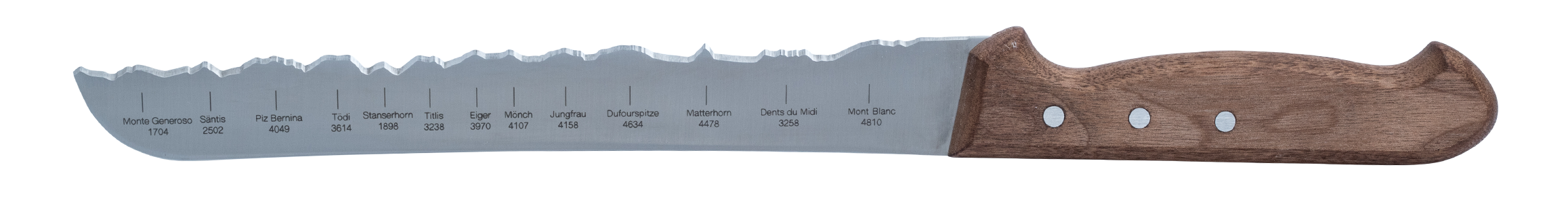 Wer sich vor lauter wunderbaren Bergketten nicht entscheiden kann, kauft das Best of Switzerland Brotmesser. Aus jeder Region ist der wichtigste Gipfel drauf.