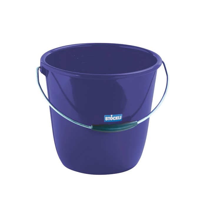Blauer, lebensmittelechter Zehnliter-Eimer mit geprägter Skala. Der Kunststoffkessel ist pflegeleicht und stabil, der robuste Metallbügel ist mit einem praktischen Kunststoffgriff ausgestattet. Swiss Made