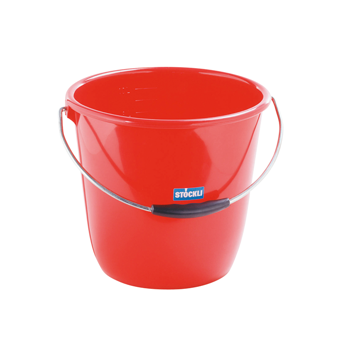 Roter, lebensmittelechter Zehnliter-Eimer mit geprägter Skala. Der Kunststoffkessel ist pflegeleicht und stabil, der robuste Metallbügel ist mit einem praktischen Kunststoffgriff ausgestattet. Swiss Made