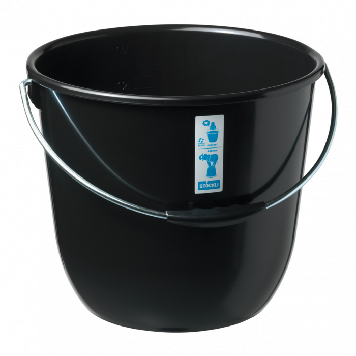 Der schwarze Fünfzehnliter-Eimer mit geprägter Skala. Wir haben ihn für Umweltbewusste aus stabilem Kunststoff-Recyclingmaterial hergestellt und mit robustem Metallbügel und Kunststoffgriff ausgestattet. Nicht lebensmittelecht. Swiss Made