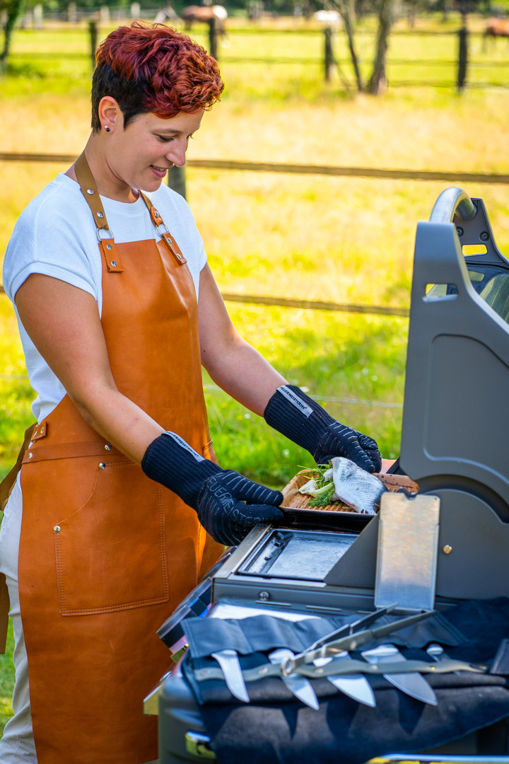 - Ausstattung - Grillschürzen speziell für die Frau am Grill entwickelt aus Nappa/VegLine-Leder in der Farbe cognac/braun.