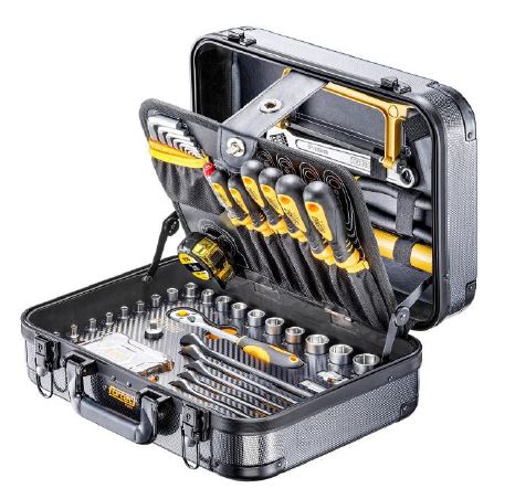 Mit seinen kompakten Abmessungen, seinem umfangreichen Inhalt und seinem ABS Gehäuse, bietet dieser Werkzeugkoffer ein Maximum an Werkzeugen auf kleinstem