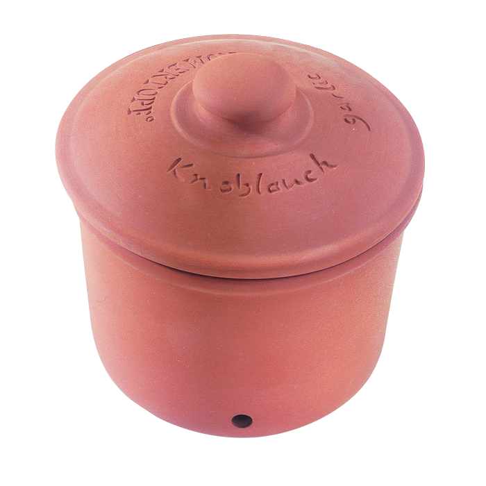 Frischer Knoblauch ist ein Segen für die Gesundheit und sollte eigentlich immer im Haus sein. Damit er dort dann auch tatsächlich lange frisch bleibt, haben wir eigens einen Vorratstopf aus rotem Ton aus dem Westerwald entwickelt. Das Material allein wirkt schon wie eine natürliche Klimaanlage. Zusammen mit den Belüftungslöchern, die die Luft optimal zirkulieren lassen, haben weder Schimmel noch Staunässe eine Chance. Rund 200 Gramm der gesunden Knollen passen bequem in den Topf, der für eine leichtere Reinigung innen glasiert ist.