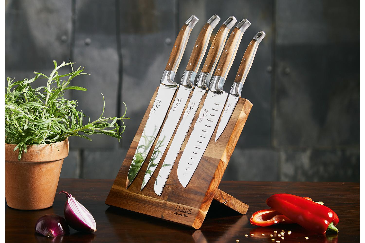 Das Messerset hier besteht aus einem magnetischen Messerblock aus 5 verschiedenen Messern mit Olivenholzgriffen.