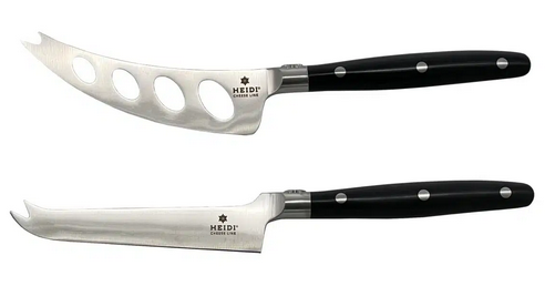 Käsemesser 2er-Set von Heidi, mit einem Weichkäsemesser und einem Universalmesser. Ihre Griffe sind aus schwarzem ABS und werden von 3 Metallnieten gehalten. Der Kropf des Messers ist mit einem Edelweiss-Relief verziert, dem charakteristischen Motiv der Marke Heidi.