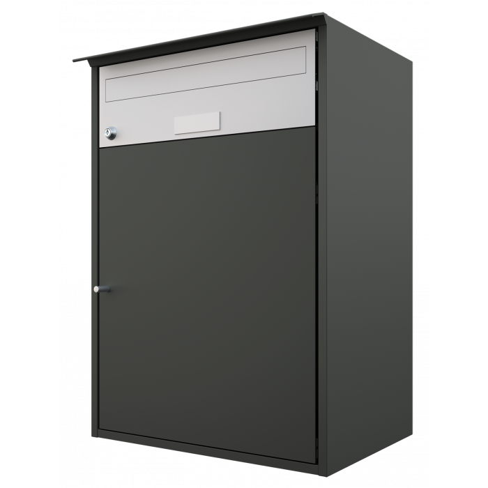 Ganzalukonstruktion mit Regenschutzleiste, mit Ablagefach, 40 l, Gehäuse und Ablagefachtüre pulverbeschichtet, Ablagefach in Kastenfarbe, Briefeinwurf farblos eloxiert, einfache Montage auf Einzelstütze, Seitenstützen oder Wandmontage mit Wandkonsole, Lieferumfang: Sicherheitsschloss mit 2 Schlüssel, Rundzylinder-Ausschnitt 22 mm, auswechselbares Alu-Namenschild, ohne Stützen, zusätzlich erhältlich: "Bitte keine Werbung"-Schild, keine Gruppenkombination möglich