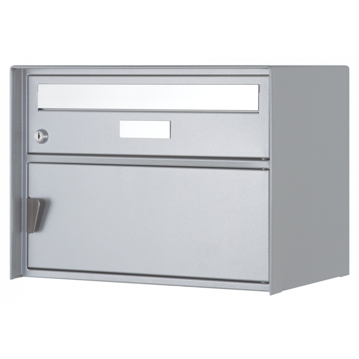 Sendzimirverzinktes Stahlblech weissaluminium mit flache Front, Gehäuse und Ablagefachtüre pulverbeschichtet, Ablagefach in Kastenfarbe, Briefeinwurf farblos eloxiert, einfache Montage auf Einzelstütze, Seitenstützen oder Wandmontage mit Wandkonsole