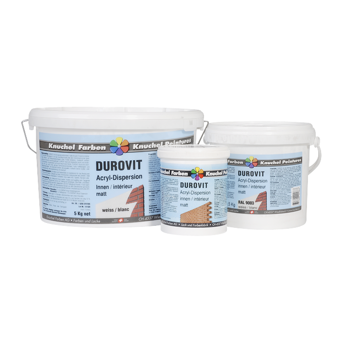 DUROVIT ist eine wasserverdünnbare, seidenmatte Acrylat-Dispersionsfarbe mit höchstem Weissgrad. Es ist das Qualitätsprodukt unter den Innendispersionen dank hoher Wasch- und Scheuerbeständigkeit (über 15’000 Schüben), Deckkraft (vielfach genügt ein Anstrich) und Ausgiebigkeit (tiefes spezifisches Gewicht). DUROVIT lässt sich angenehm leicht und ansatzfrei verarbeiten, ist gerucharm und spritzt kaum beim Rollen. DUROVIT Anstriche zeichnen sich aus durch eine geringe Schmutzempfindlichkeit, hohe Haftfestigkeit und Alkalibeständigkeit sowie Lichtechtigkeit (keine Dunkel- oder Lichtvergilbung) und sind alterungsbeständig (rissfrei) dank hoher Elastizität.