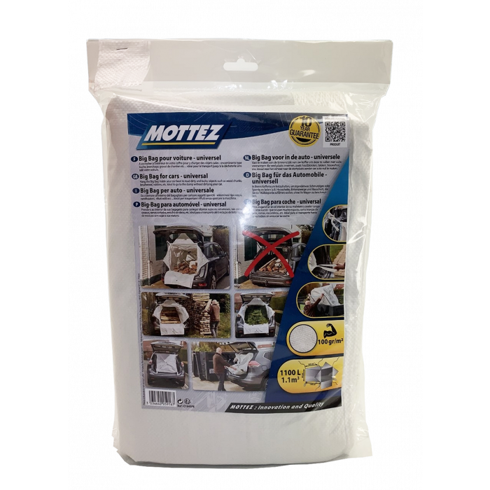 das Big Bag stellt man im Autokofferraum, mit 4 kleinen Laschen ausgestattet, Material: Polypropylen 100 gr. pro m2, Gewicht 1,17 kg, Abmessungen: L 140 x B 100 x H 80 cm