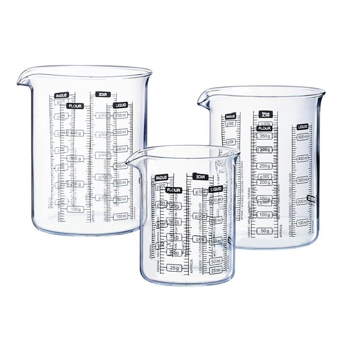 Abmessungen für Zucker, Reis, Mehl und Flüssigkeiten in Millimeter, nicht auf Herdplatte stellen, mikrowellentauglich, keine kalte Flüssigkeit in heisses Gefäss füllen und keine Scheuermittel verwenden, spülmaschinengeeignet