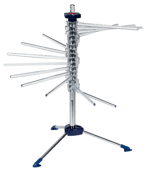 an seinen 16 kräftigen Armen aus Kristallpolycarbonat können mit Hilfe des praktischen Lineals 2 kg frische Nudeln aufgehängt werden, das Mehrzwecklineal in der Mittelsäule aus Chromstahl eingebaut, kann zum Schneiden des Teigs verwendet werden, der Nudelständer öffnet sich wie ein Fächer, muss nicht demontiert werden und braucht deshalb wenig Platz