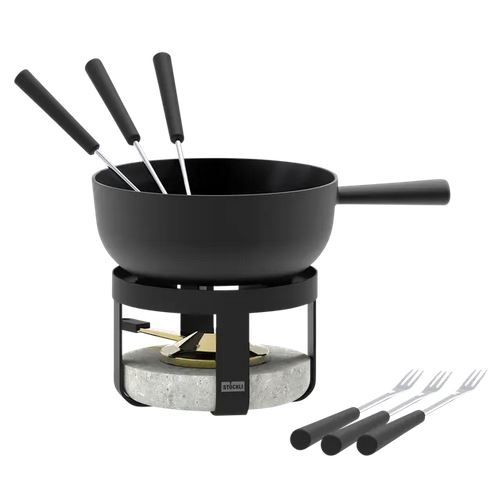 Die STÖCKLI Käsefonduegarnitur Pilatus Stone Classic bietet ein elegantes Fondueerlebnis für gesellige Runden. Das Caquelon ermöglicht gleichmässig geschmolzenen Käse für bis zu sechs Personen. Das Beton Rechaud verleiht Stabilität und eine edle Optik, während der goldfarbene Pastenbrenner ein stilvolles Detail darstellt. Ergänzt wird das Set durch sechs Fonduegabeln mit schwarzen Kunststoffgriffen, wodurch Funktionalität und Design harmonisch kombiniert werden. Diese Garnitur eignet sich ideal für gemeinsame Abende.