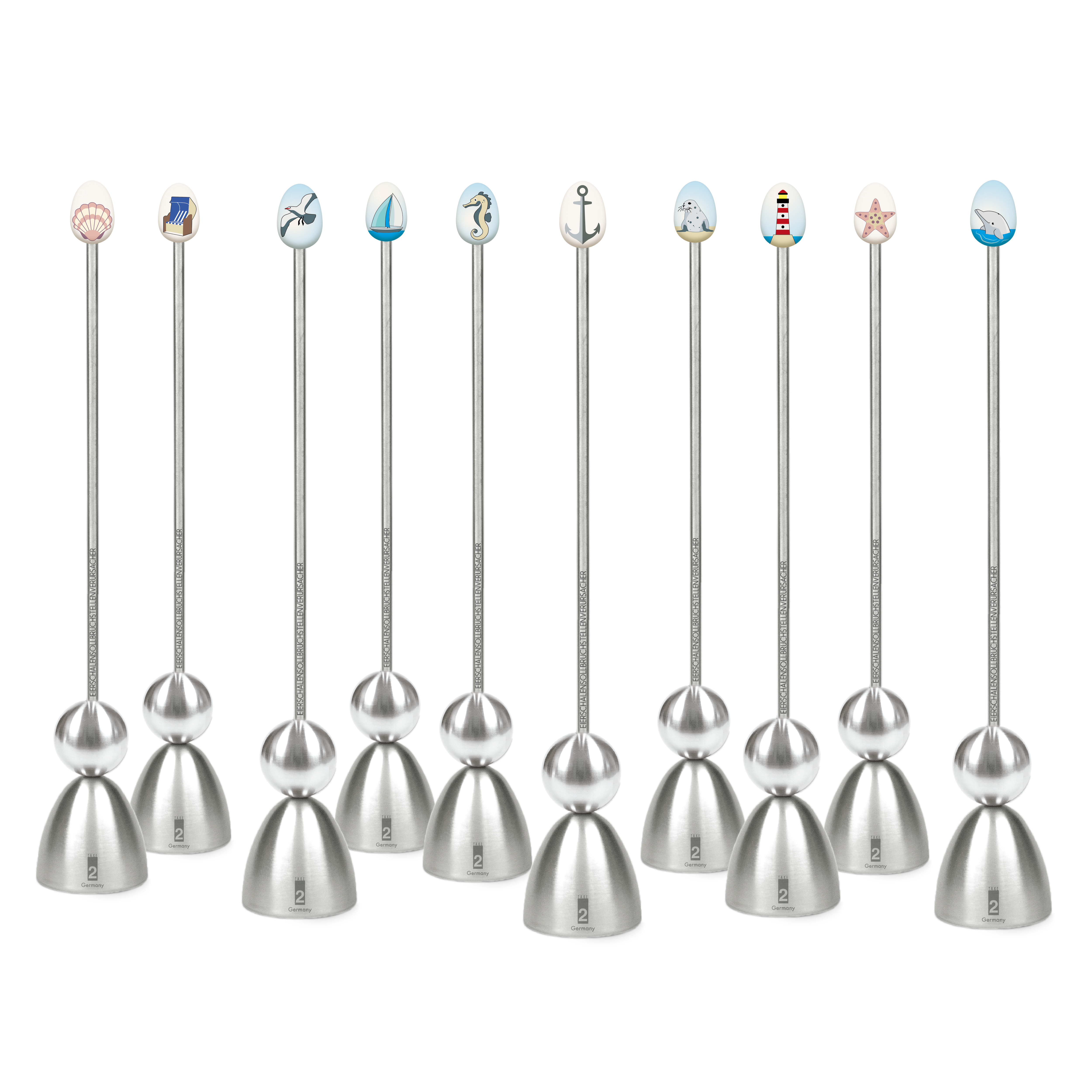 Metallkappe auf das weich oder hart gekochte Ei setzen, die Schlagkugel am Führungsstab frei fallen lassen -CLACK!