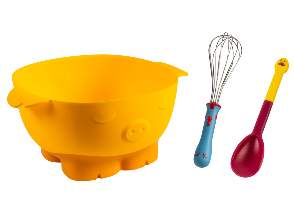 Das Tier-Trio aus der rutschsicheren Schüssel, dem ergonomischen Schwingbesen und dem praktischen Löffel, machen das Zubereiten von Speisen zum Vergnügen. Sei es für das Verquirlen von Eiern für leckere Pancakes oder die Teigzubereitung für eine fruchtige Wähe. Tierischer Spass beim Kochen ist für die gesamte Familie garantiert.
