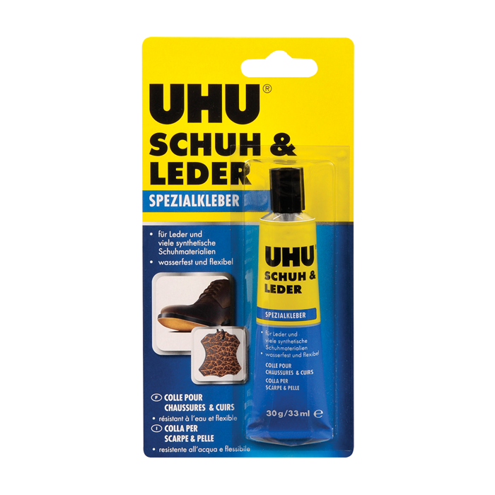 schnellanziehender Spezialkleber für Schuh- und Lederverklebungen, der zäh-elastische Klebefilm gleicht Materialspannungen aus, ist wasserfest und temperaturbeständig, sowie beständig gegen Öl, verdünnte Säuren und Laugen, geeignet zum Verkleben von Leder, Gummi und vielen Kunststoffen, nicht geeignet für PE, PP, Weich-PVC und Styropor®