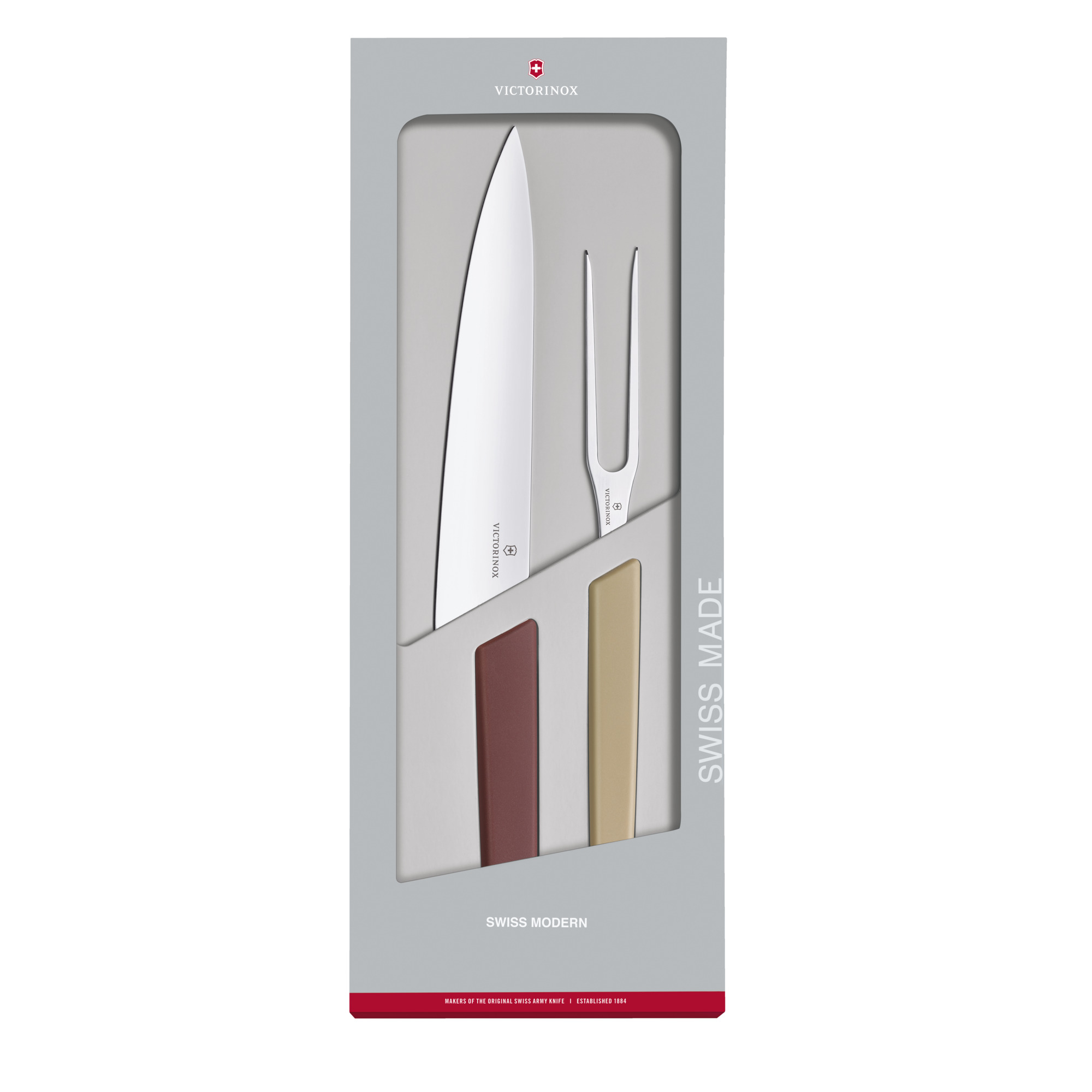 Schönheit trifft bei diesem 2-teiligen Swiss Modern Tranchier-Set auf wahre Qualität. Genau wie die anderen Teile aus der Kollektion sind Tranchiergabel und -messer ergonomisch geformt und bieten ultimativen Komfort. Die Gabel mit zwei Zinken hält den Braten fest an seinem Platz, während die gerade geschliffene Edelstahlklinge des Messers mühelos durch jede Art von Fleisch gleitet. Das 2-teilige Set mit glatten Kunststoffgriffen liegt sicher in der Hand und macht das Tranchieren zum Kinderspiel.